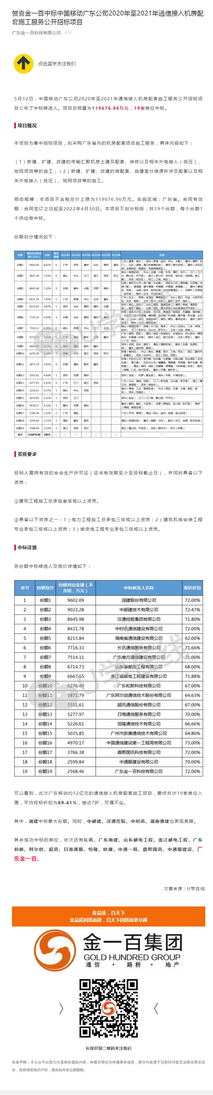 贺喜金一百中标中国移动广东公司2020年至2021年通信接入机房配套施工服务公开招标项目